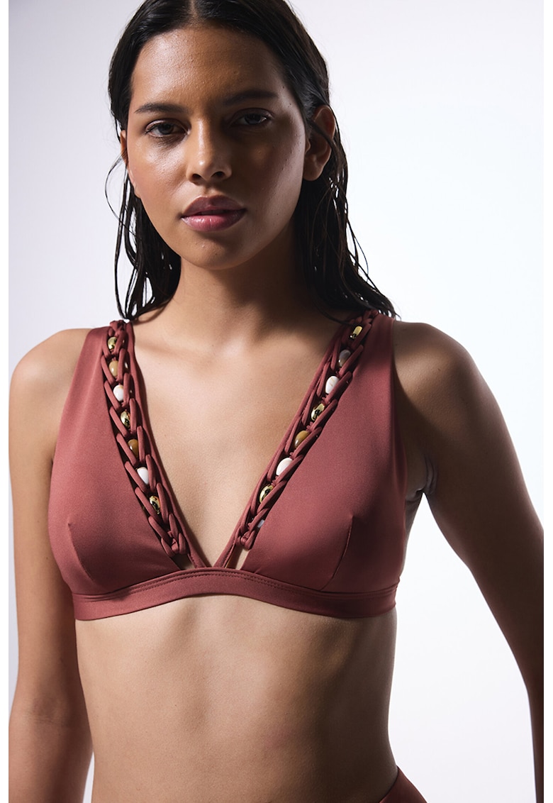 Detalii generale Tip produs: sutien Culoare: maro cognac Imprimeu: uni Forma cupa: triunghi Material: sintetic Barete: ajustabile Detalii: margele decorative Sistem inchidere: clema Design Sustinere metalica: fara sarma Stil decolteu: v Compozitie Exterior: 85% poliester