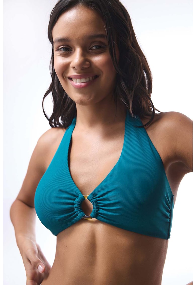 Detalii generale Tip produs: sutien Culoare: verde marin Imprimeu: uni Forma cupa: triunghi Material: sintetic Sistem inchidere: snur Design Tip sutien: cu burete Sustinere metalica: fara sarma Stil decolteu: halter Compozitie Exterior: 84% poliester