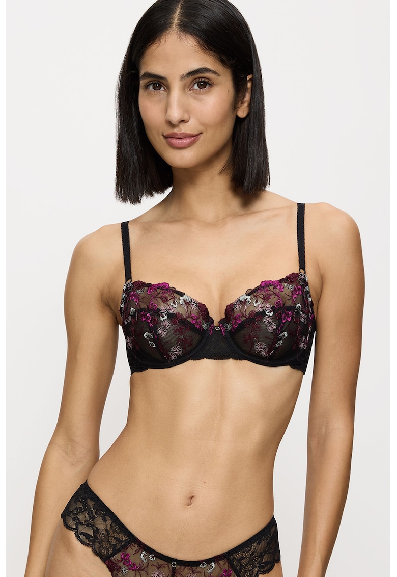 - poliamida Imprimeu: floral Barete: ajustabile Forma cupa: balconette Burete cupa: cu burete subtire Sustinere metalica: cu sarma Detalii: dantela cu model floral Compozitie Exterior: 58% poliamida