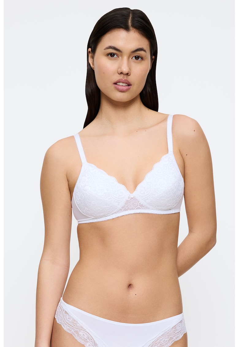 Caracteristici Tip produs: sutien Culoare: alb optic Material: dantela Imprimeu: floral Barete: ajustabile Forma cupa: acoperire completa Burete cupa: cu burete Sustinere metalica: cu sarma Sistem inchidere: tija si anou Compozitie Exterior: 47% poliamida