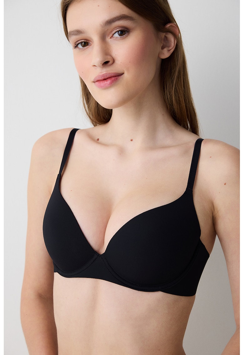 Caracteristici Tip produs: sutien Culoare: negru Material: sintetic Imprimeu: uni Barete: ajustabile Forma cupa: clasic Burete cupa: cu burete subtire Sustinere metalica: cu sarma Sistem inchidere: clasp Compozitie Exterior: 75% poliamida