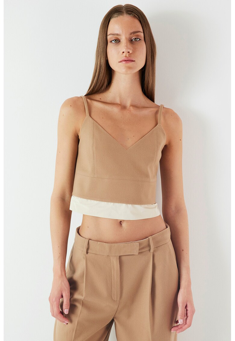 Caracteristici Culoare: maro camel Imprimeu: uni Stil: casual Croiala: crop Sistem inchidere: fara inchidere Material: sintetic