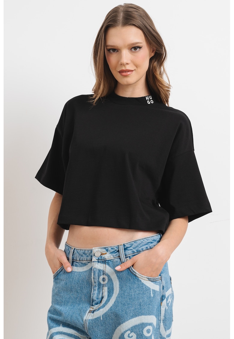 Caracteristici Culoare: negru Imprimeu: uni Material: bumbac Croiala: crop Model: decolteu la baza gatului Maneci: fluture Lungime maneca: maneca medie Compozitie Exterior: 100% bumbac Info model Modelul poarta un produs de marimea S/36 EU. Marimi model: 176 cm inaltime