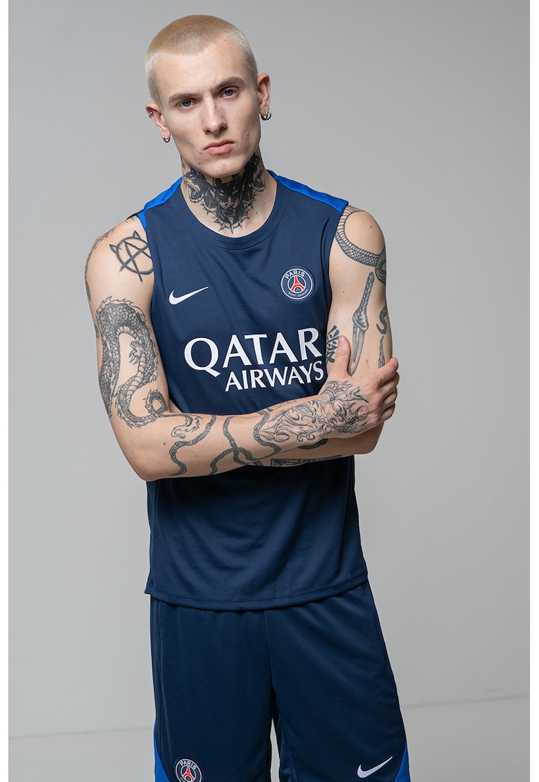 - albastru inchis Imprimeu: logo Croiala: regular fit Stil decolteu: rotund Material: poliester Tehnologie material: dri-fit Detalii: material ce indeparteaza umezeala Detalii material Exterior: 100% poliester Info model Modelul poarta un produs de marimea M. Marimi model: 188 cm inaltime