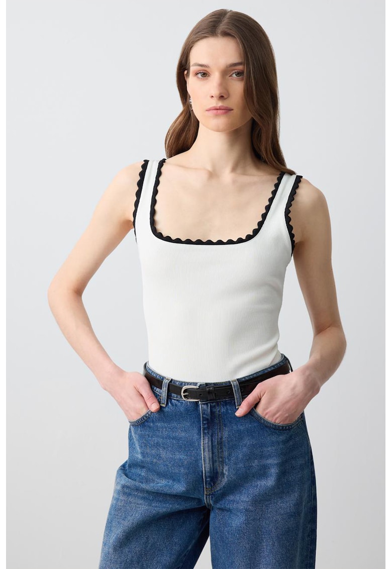 - negru Imprimeu: uni Stil: casual Croiala: regular fit Sistem inchidere: fara inchidere Material: sintetic Decolteu: patrat Lungime maneca: fara maneca Detalii: terminatii valurite Compozitie Exterior: 92% poliester