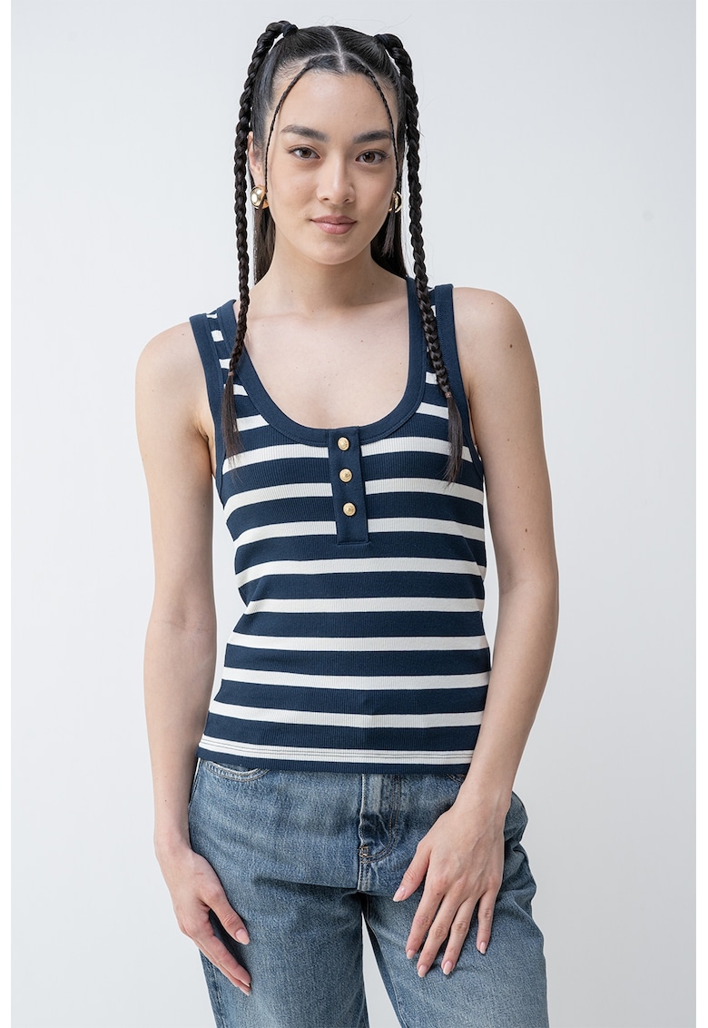 - albastru ultramarin Imprimeu: dungi Material: bumbac Croiala: regular fit Model: rotund Compozitie Exterior: 95% bumbac