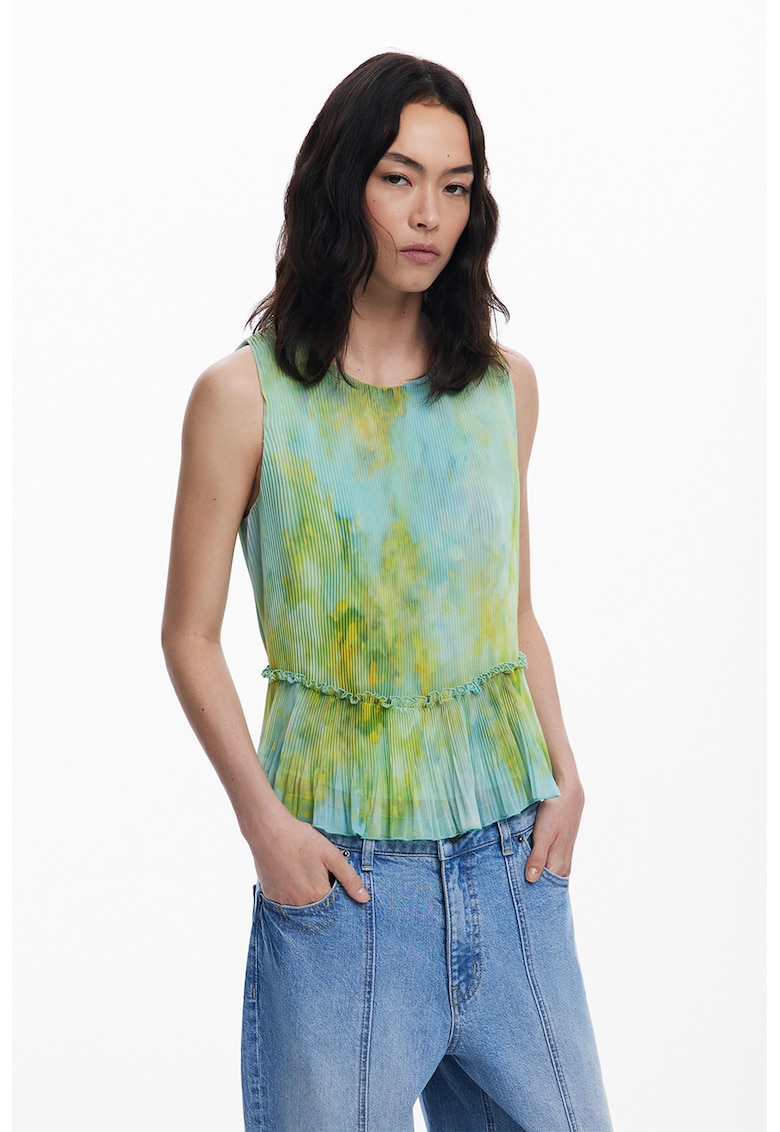 - albastru deschis Imprimeu: tie-dye Stil: casual Croiala: regular fit Sistem inchidere: nasturi Material: sintetic Decolteu: la baza gatului Lungime maneca: fara maneca Detalii: aspect plisat