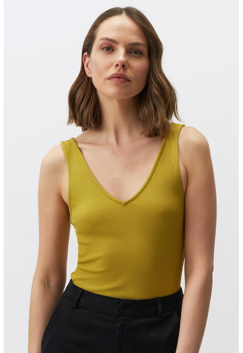 Caracteristici Culoare: verde masliniu Imprimeu: uni Material: sintetic Croiala: regular fit Model: in v Barete: late Lungime maneca: fara maneca Detalii: aspect striat Compozitie Exterior: 90% poliamida