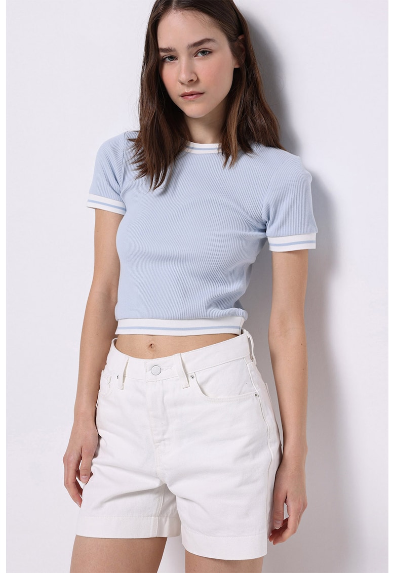 - elastan Croiala: slim fit Model: decolteu la baza gatului Lungime maneca: maneca scurta Detalii: terminatii cu dungi