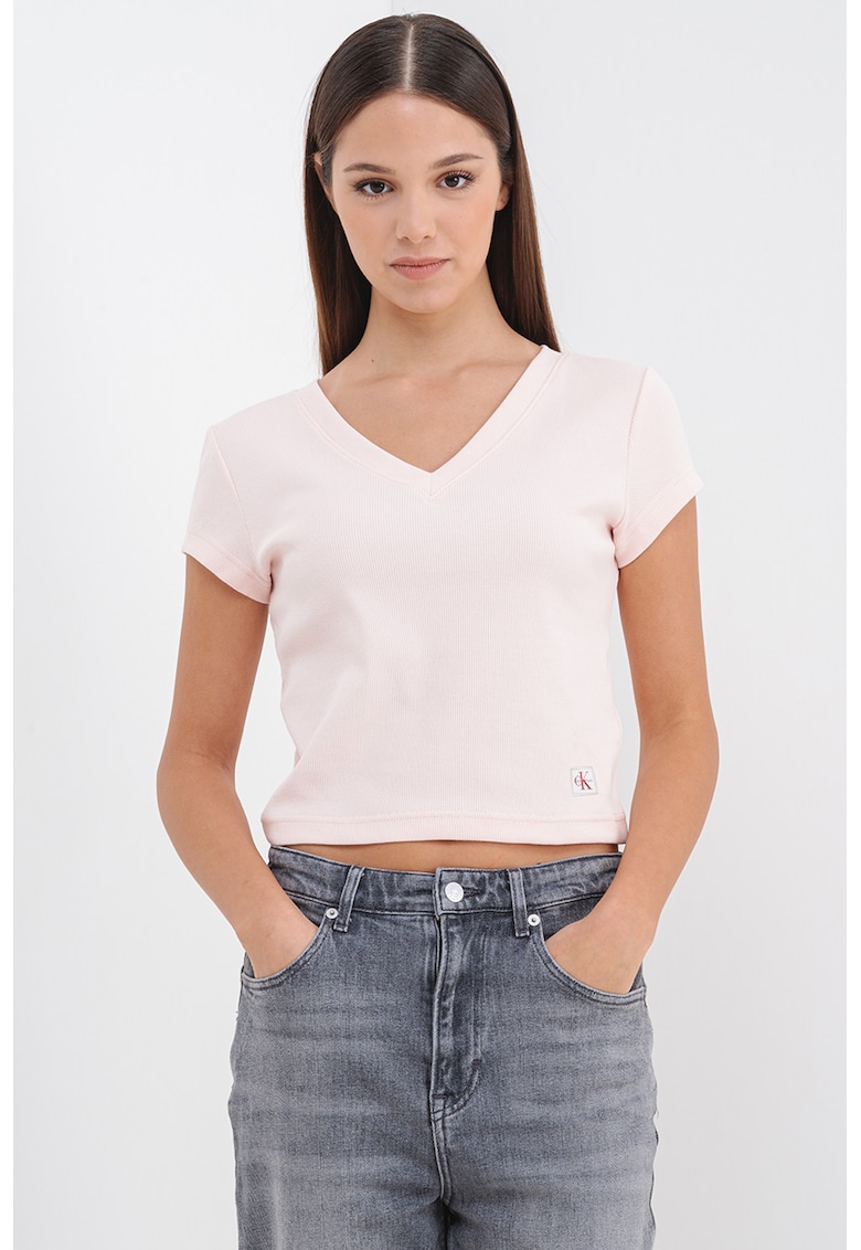 Caracteristici Culoare: roz pastel Imprimeu: uni Material: bumbac Croiala: crop Model: in v Lungime maneca: maneca scurta Compozitie Exterior: 95% bumbac