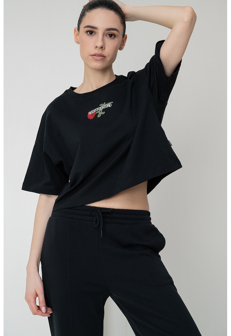 - negru Imprimeu: uni Material: bumbac Croiala: crop Model: decolteu la baza gatului Maneci: cazute Lungime maneca: maneca scurta Compozitie Exterior: 100% bumbac Info model Modelul poarta un produs de marimea S. Marimi model: 177 cm inaltime