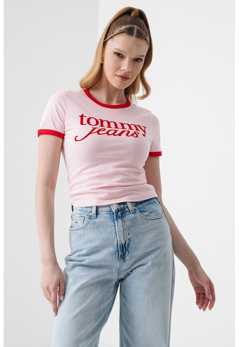- rosu vermillion Imprimeu: logo Material: bumbac Croiala: crop Model: decolteu la baza gatului Lungime maneca: maneca scurta Compozitie Exterior: 100% bumbac regenerativ Info model Modelul poarta un produs de marimea S. Marimi model: 176 cm inaltime