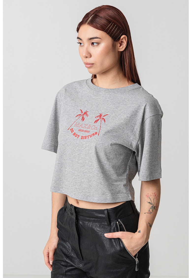 Caracteristici Culoare: gri deschis Imprimeu: text Material: bumbac Croiala: crop Model: decolteu la baza gatului Lungime maneca: maneca scurta Compozitie Exterior: 100% bumbac Info model Modelul poarta un produs de marimea S/38 IT. Marimi model: 173 cm inaltime