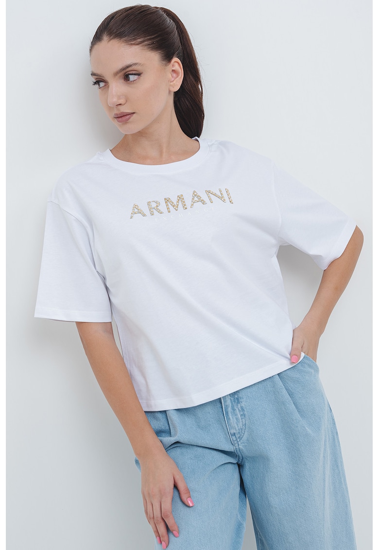 - auriu Imprimeu: logo Material: bumbac Croiala: crop Model: decolteu la baza gatului Maneci: cazute Lungime maneca: maneca medie Compozitie Exterior: 100% bumbac Info model Modelul poarta un produs de marimea S. Marimi model: 175 cm inaltime
