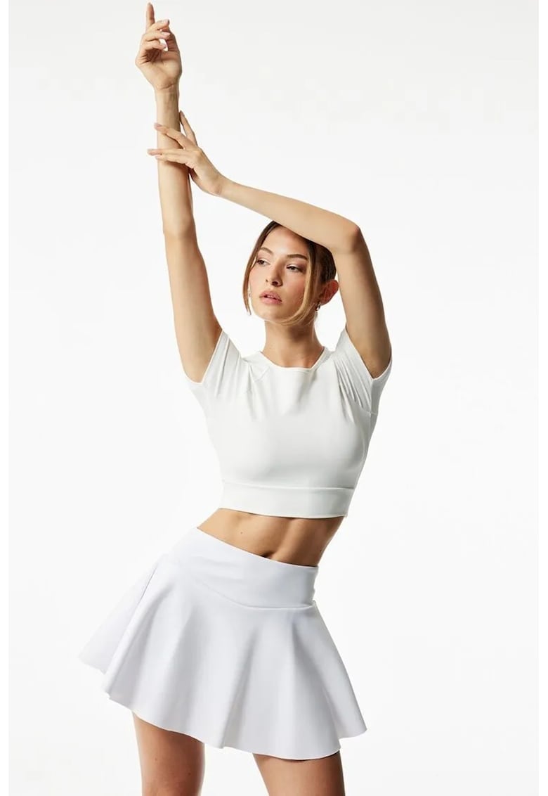 Caracteristici Culoare: alb murdar Imprimeu: uni Material: sintetic Croiala: crop Model: decolteu la baza gatului Maneci: raglan Lungime maneca: maneca scurta Detalii: slim fit