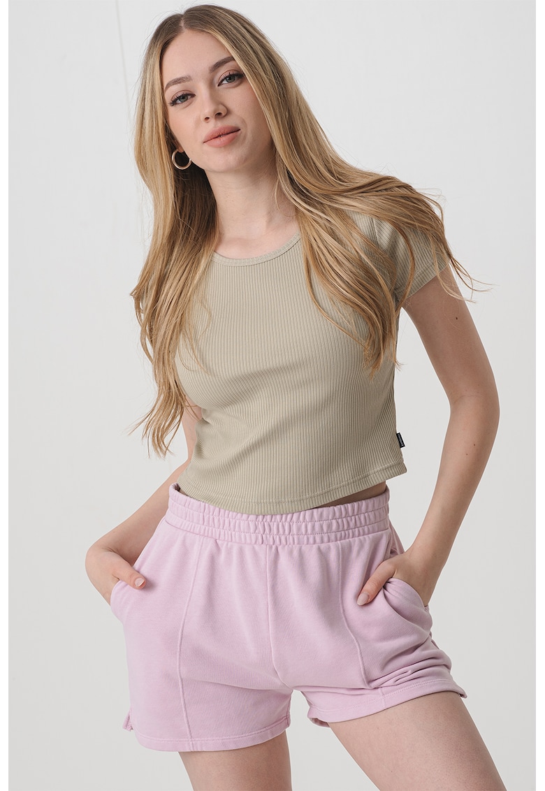 Caracteristici Culoare: verde prafuit Imprimeu: uni Material: bumbac Croiala: crop Model: rotund Lungime maneca: maneca scurta Detalii: aspect striat Compozitie Exterior: 95% bumbac