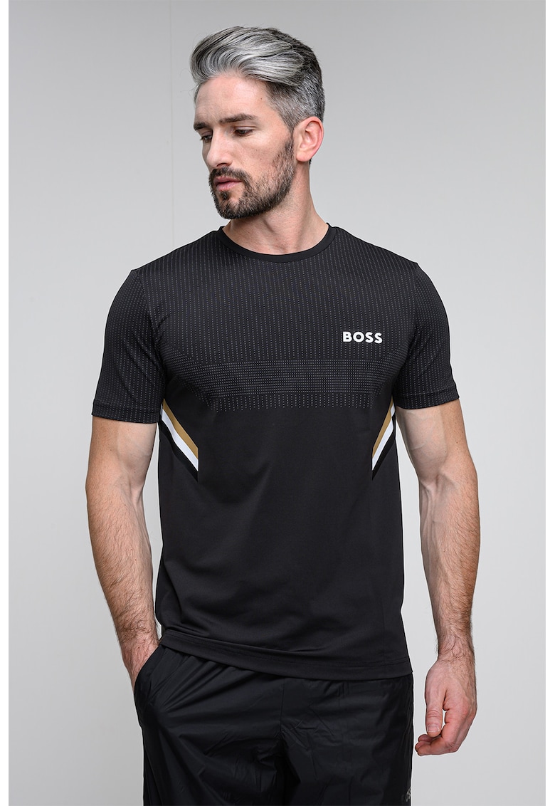 Caracteristici Culoare: negru Imprimeu: uni Material: sintetic Croiala: regular fit Model: decolteu la baza gatului Lungime maneca: maneca scurta Compozitie Exterior: 93% poliester reciclat