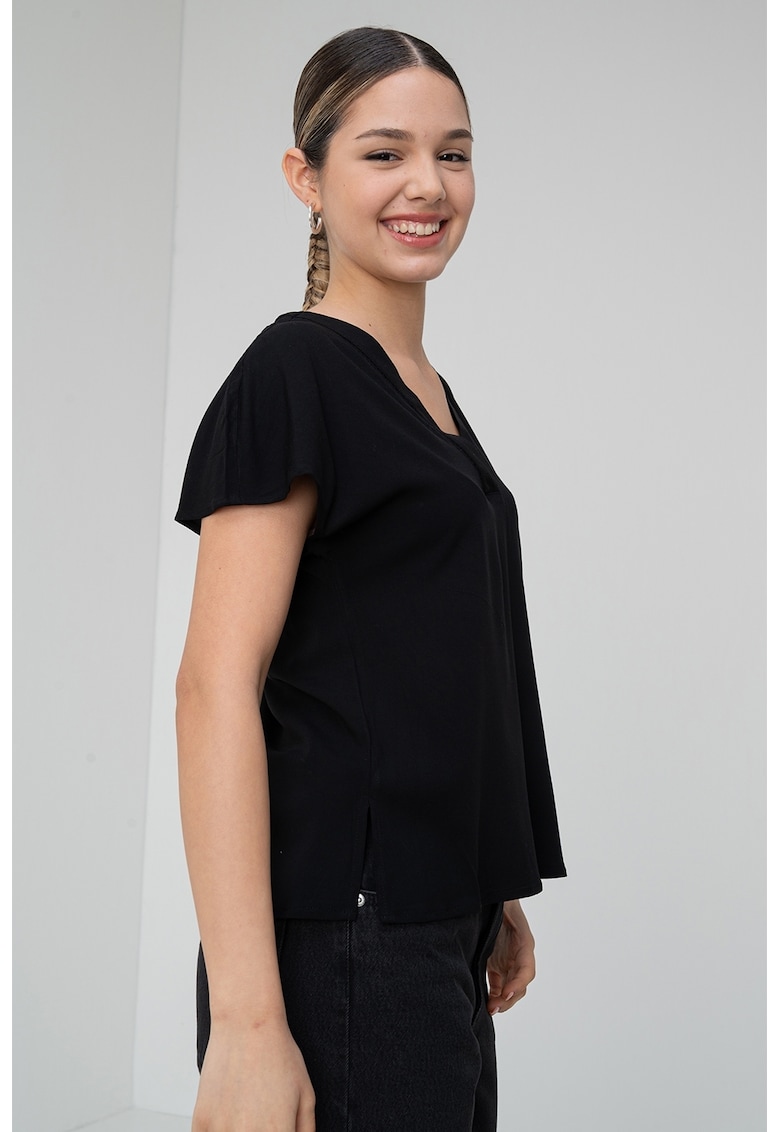 Caracteristici Culoare: negru Imprimeu: uni Material: viscoza Croiala: regular fit Model: in v Lungime maneca: maneca scurta Compozitie Exterior: 97% viscoza lenzing™ecovero™