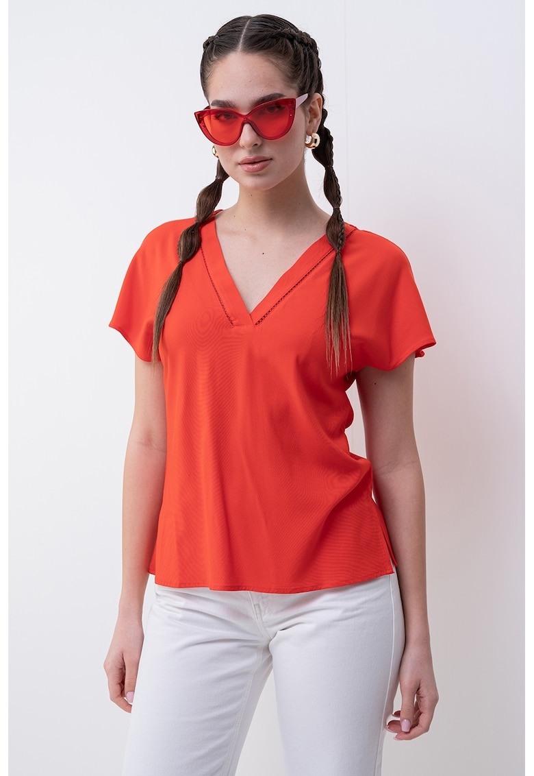 Caracteristici Culoare: rosu vermillion Imprimeu: uni Material: viscoza Croiala: regular fit Model: in v Lungime maneca: maneca scurta Compozitie Exterior: 97% viscoza lenzing™ecovero™
