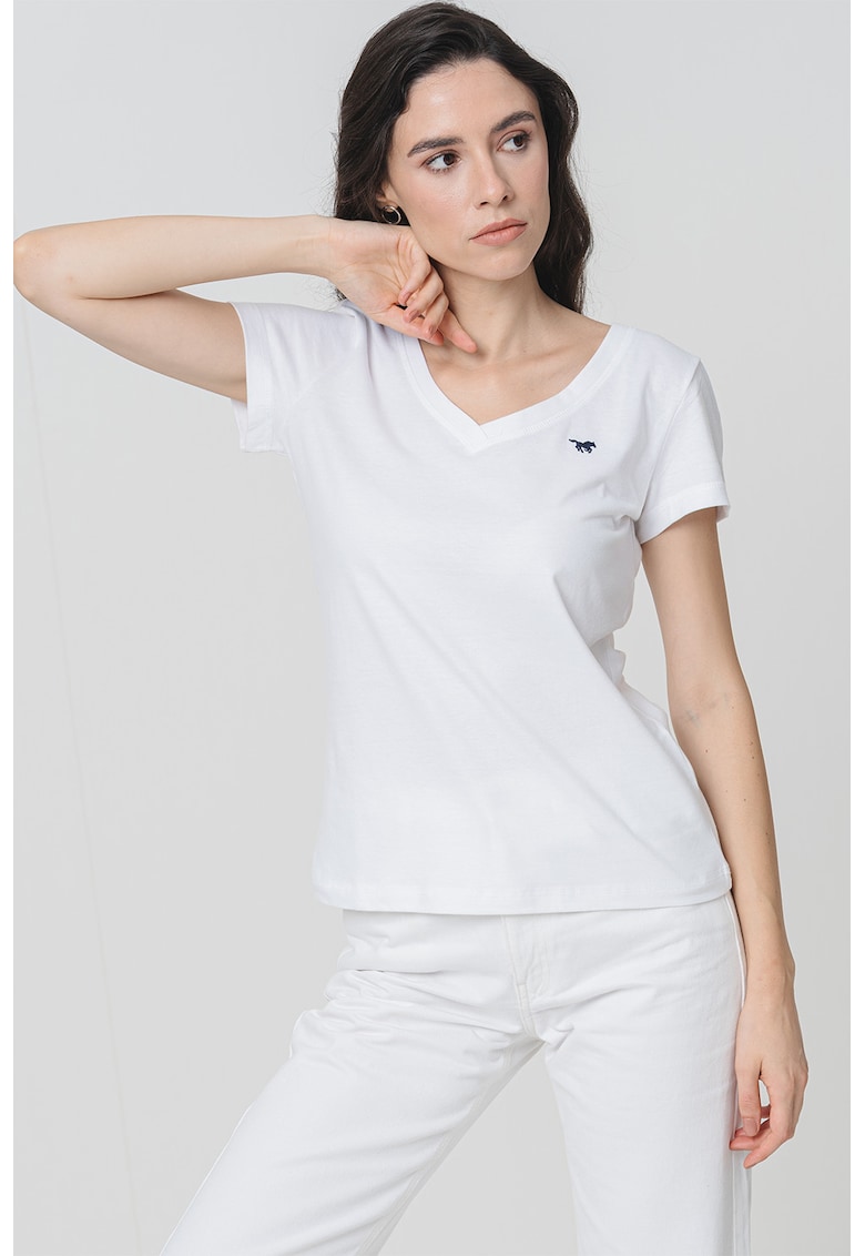 Caracteristici Culoare: alb Imprimeu: uni Material: bumbac Croiala: slim fit Model: in v Lungime maneca: maneca scurta Compozitie Exterior: 100% bumbac Info model Modelul poarta un produs de marimea S. Marimi model: 177 cm inaltime