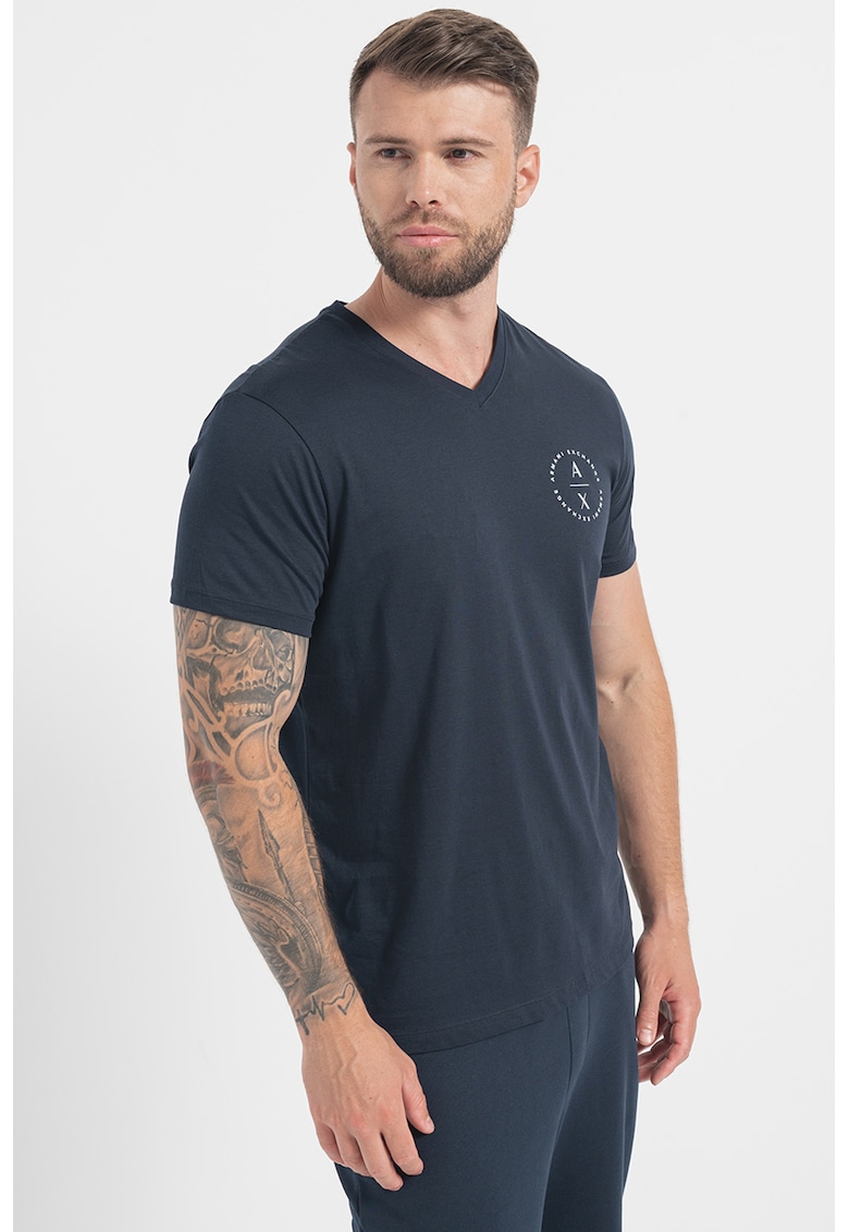 Caracteristici Culoare: bleumarin Imprimeu: uni Material: bumbac Croiala: regular fit Model: in v Lungime maneca: maneca scurta Compozitie Exterior: 100% bumbac Info model Modelul poarta un produs de marimea M. Marimi model: 185 cm inaltime