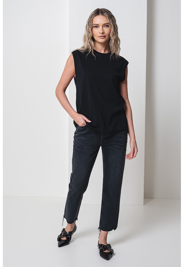 Caracteristici Culoare: negru Imprimeu: uni Material: bumbac Croiala: regular fit Model: decolteu la baza gatului Lungime maneca: fara maneca Compozitie Exterior: 100% bumbac Info model Modelul poarta un produs de marimea S. Marimi model: 174 cm inaltime