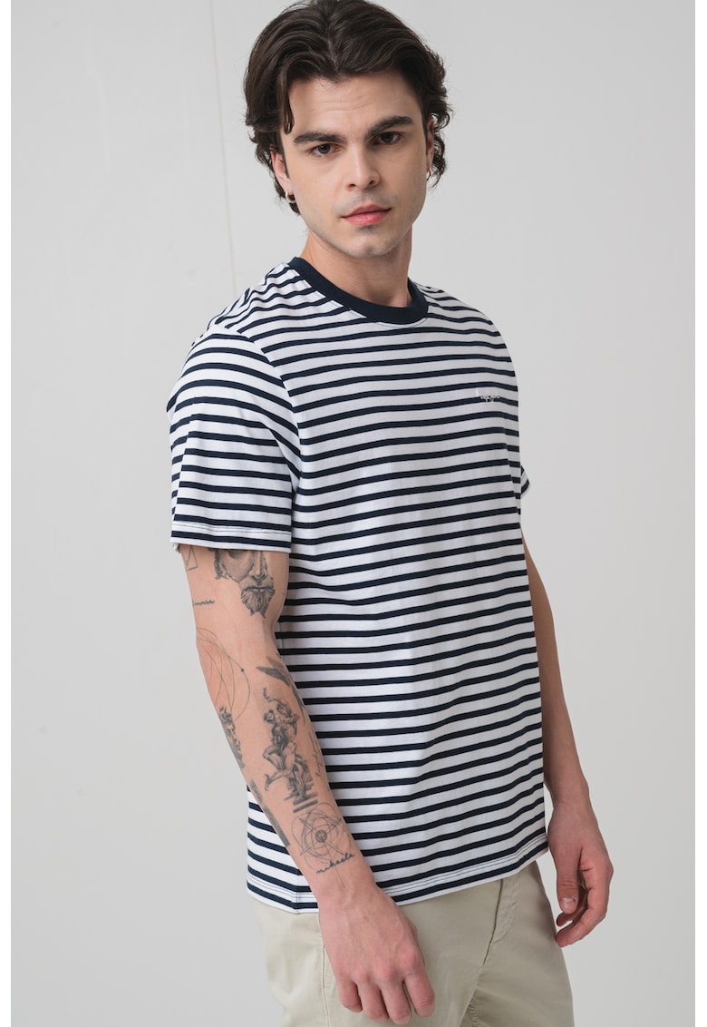 - bleumarin Imprimeu: dungi Material: bumbac Croiala: regular fit Model: decolteu la baza gatului Lungime maneca: maneca scurta Compozitie Exterior: 100% bumbac Info model Modelul poarta un produs de marimea M. Marimi model: 180 cm inaltime