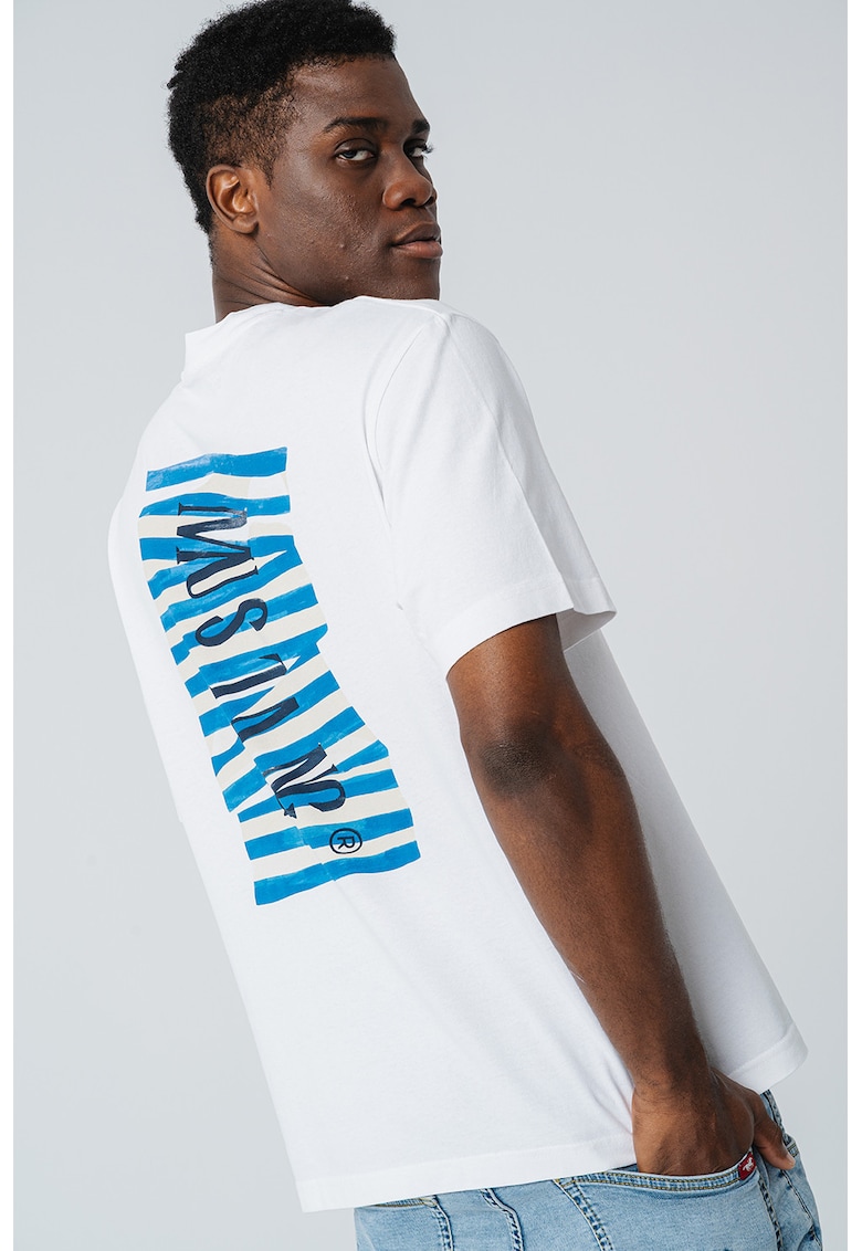 - albastru Imprimeu: grafic Material: bumbac Croiala: regular fit Model: decolteu la baza gatului Lungime maneca: maneca scurta Compozitie Exterior: 100% bumbac Info model Modelul poarta un produs de marimea M. Marimi model: 184 cm inaltime