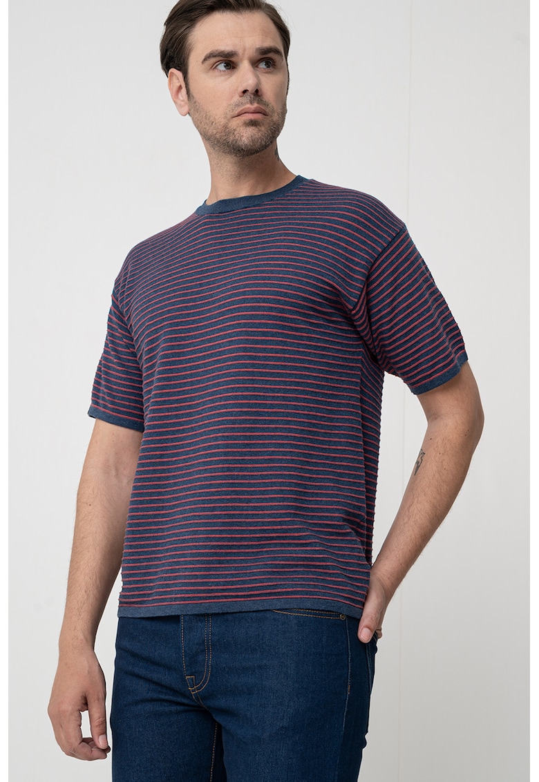 - bleumarin Imprimeu: dungi Material: bumbac Croiala: regular fit Model: decolteu la baza gatului Lungime maneca: maneca scurta Compozitie Exterior: 100% bumbac Info model Modelul poarta un produs de marimea M. Marimi model: 195 cm inaltime