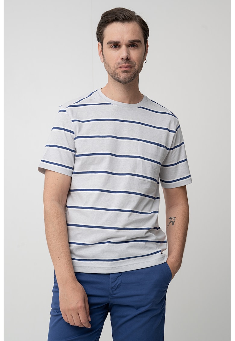 - gri melange Imprimeu: dungi Material: bumbac Croiala: regular fit Model: decolteu la baza gatului Lungime maneca: maneca scurta Compozitie Exterior: 100% bumbac Info model Modelul poarta un produs de marimea M. Marimi model: 195 cm inaltime