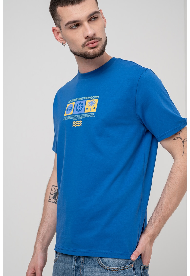 - albastru royal Imprimeu: grafic Material: bumbac Croiala: regular fit Model: decolteu la baza gatului Lungime maneca: maneca scurta Compozitie Exterior: 100% bumbac Info model Modelul poarta un produs de marimea M. Marimi model: 190 cm inaltime