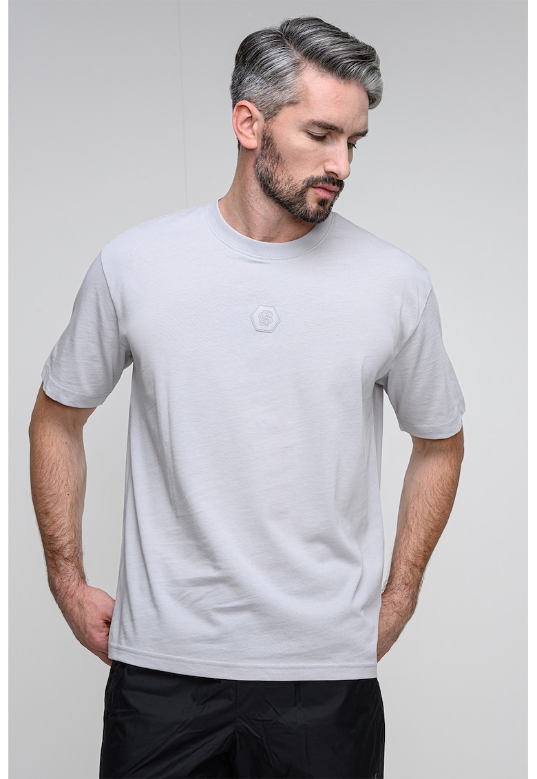 Caracteristici Culoare: gri deschis Imprimeu: uni Material: bumbac Croiala: regular fit Model: rotund Lungime maneca: maneca scurta Compozitie Exterior: 100% bumbac Info model Modelul poarta un produs de marimea M. Marimi model: 187 cm inaltime