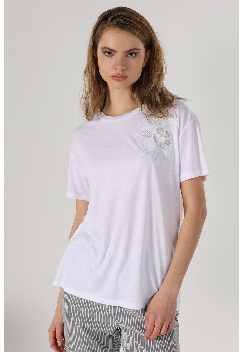 - viscoza Croiala: regular fit Model: decolteu la baza gatului Maneci: cazute Lungime maneca: maneca scurta Detalii: detalii semi-transparente Compozitie Exterior: 66% poliester