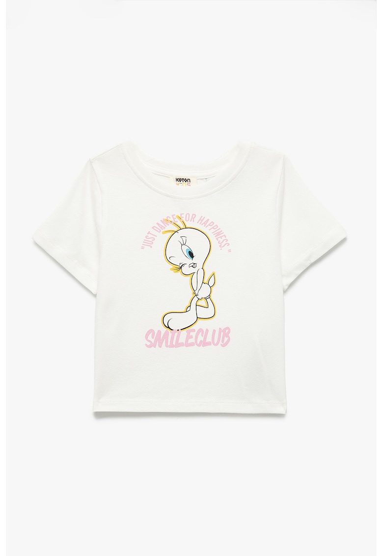 - alb murdar Material: bumbac Imprimeu: desene animate Croiala: regular fit Decolteu: la baza gatului Lungime maneca: maneca scurta Poveste/Personaj: tweety Compozitie Exterior: 97% bumbac