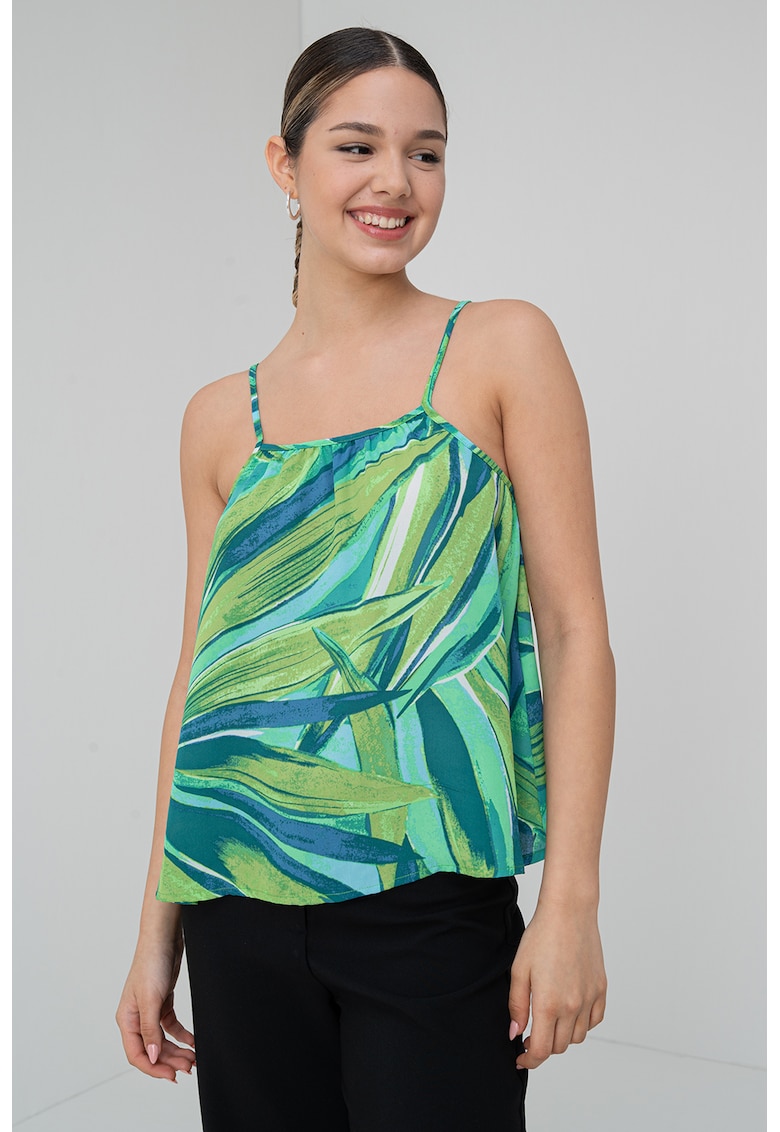 Caracteristici Culoare: verde Imprimeu: floral Material: poliester Croiala: lejer Model: rotund Barete: inguste Lungime maneca: fara maneca Compozitie Exterior: 68% poliester reciclat