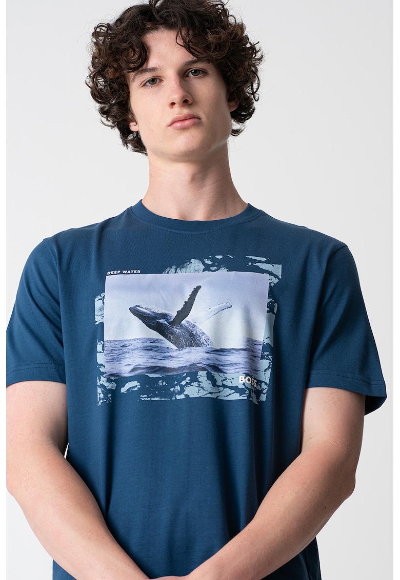 Caracteristici Culoare: albastru Imprimeu: foto Material: bumbac Croiala: regular fit Model: decolteu la baza gatului Lungime maneca: maneca scurta Compozitie Exterior: 100% bumbac Info model Modelul poarta un produs de marimea M. Marimi model: 189 cm inaltime