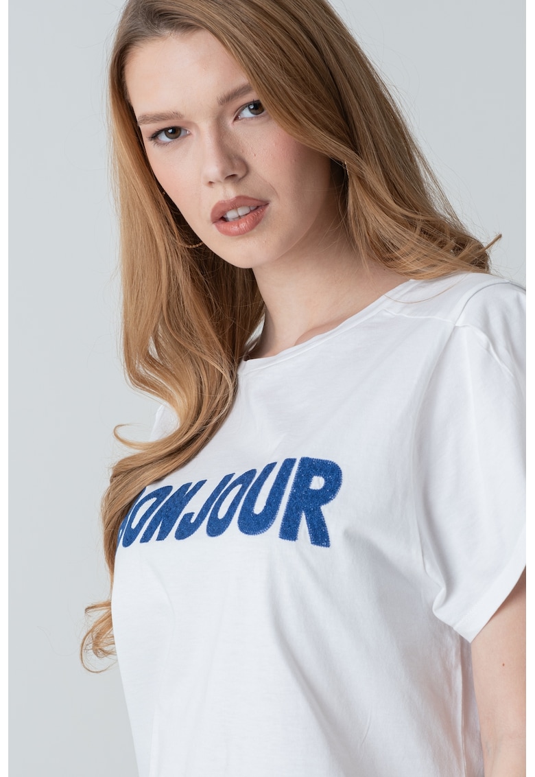 - alb murdar Imprimeu: logo Material: bumbac Croiala: regular fit Model: decolteu la baza gatului Lungime maneca: maneca scurta Compozitie Exterior: 100% bumbac Info model Modelul poarta un produs de marimea S. Marimi model: 177 cm inaltime