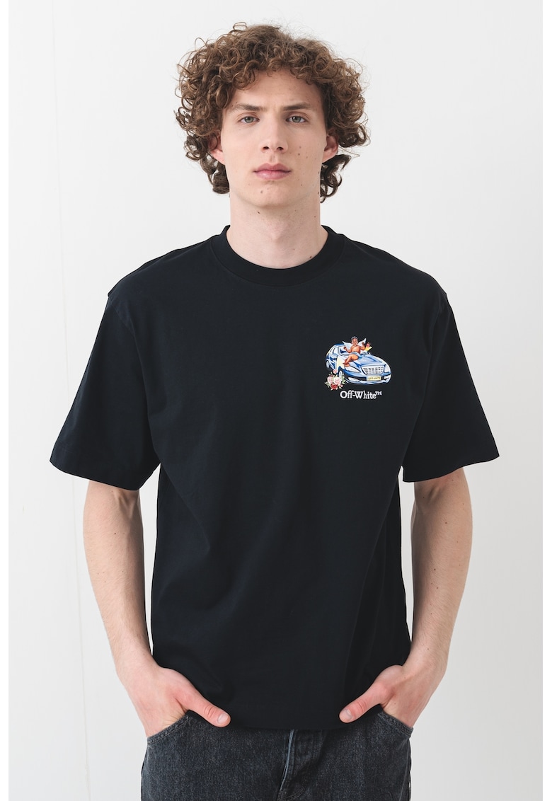 - alb optic Imprimeu: grafic Material: bumbac Croiala: regular fit Model: decolteu la baza gatului Lungime maneca: maneca scurta Compozitie Exterior: 100% bumbac Info model Modelul poarta un produs de marimea M. Marimi model: 190 cm inaltime