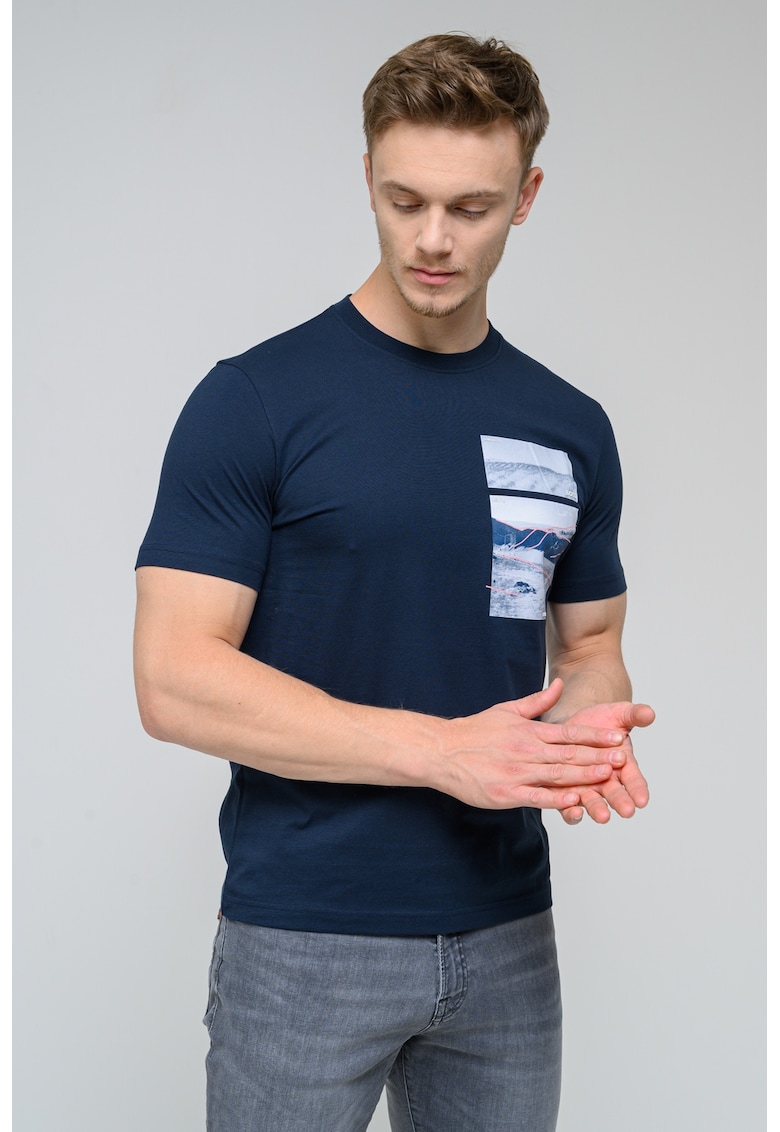 Caracteristici Culoare: bleumarin Imprimeu: foto Material: bumbac Croiala: regular fit Model: decolteu la baza gatului Lungime maneca: maneca scurta Compozitie Exterior: 100% bumbac Info model Modelul poarta un produs de marimea M. Marimi model: 191 cm inaltime