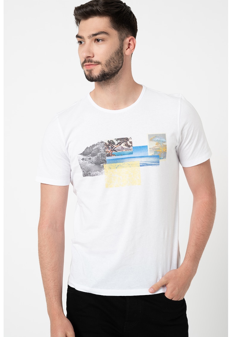 - albastru Imprimeu: foto Material: bumbac Croiala: regular fit Model: decolteu la baza gatului Lungime maneca: maneca scurta Compozitie Exterior: 100% bumbac Info model Modelul poarta un produs de marimea M. Marimi model: 190 cm inaltime