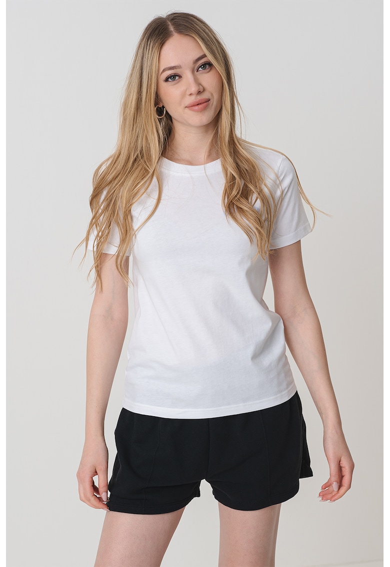 - alb optic Imprimeu: logo Material: bumbac Croiala: regular fit Model: decolteu la baza gatului Lungime maneca: maneca scurta Compozitie Exterior: 100% bumbac Info model Modelul poarta un produs de marimea S. Marimi model: 175 cm inaltime