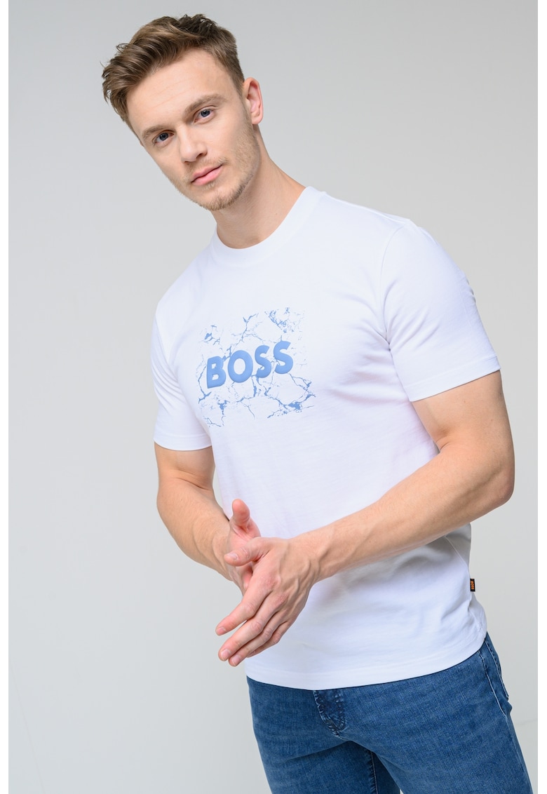 Caracteristici Culoare: alb Imprimeu: logo Material: bumbac Croiala: regular fit Model: decolteu la baza gatului Lungime maneca: maneca scurta Compozitie Exterior: 100% bumbac Info model Modelul poarta un produs de marimea M. Marimi model: 191 cm inaltime