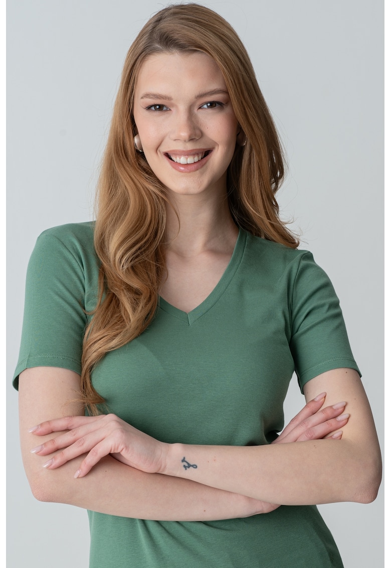Caracteristici Culoare: verde englez Imprimeu: uni Material: bumbac Croiala: regular fit Model: in v Lungime maneca: maneca scurta Compozitie Exterior: 100% bumbac Info model Modelul poarta un produs de marimea S. Marimi model: 177 cm inaltime