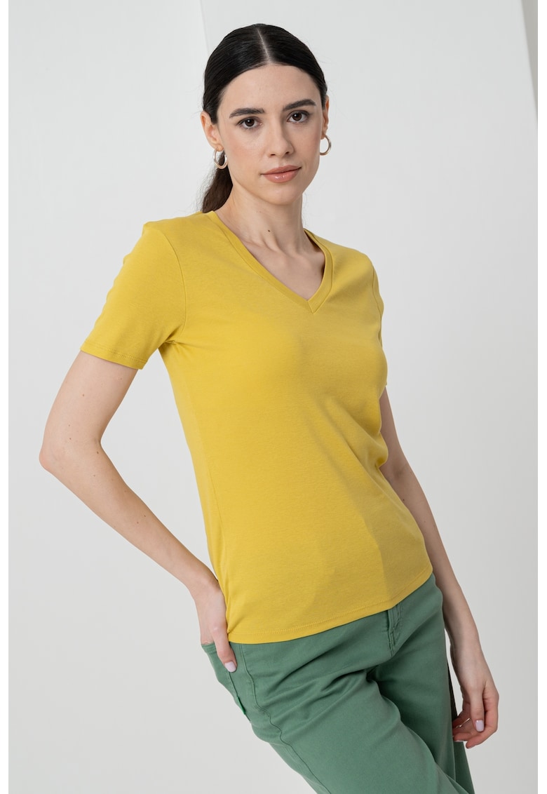 Caracteristici Culoare: galben mustar Imprimeu: uni Material: bumbac Croiala: regular fit Model: in v Lungime maneca: maneca scurta Compozitie Exterior: 100% bumbac Info model Modelul poarta un produs de marimea S. Marimi model: 177 cm inaltime