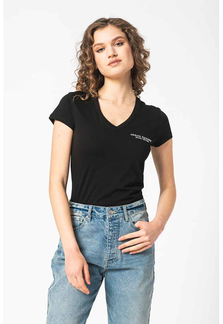 Caracteristici Culoare: negru Imprimeu: logo Material: bumbac Croiala: regular fit Model: in v Lungime maneca: maneca scurta Compozitie Exterior: 100% bumbac Info model Modelul poarta un produs de marimea S. Marimi model: 176 cm inaltime