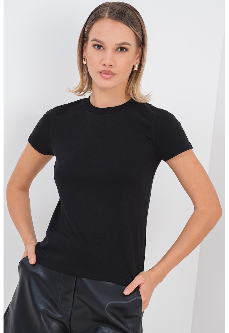 Caracteristici Culoare: negru Imprimeu: uni Material: bumbac Croiala: slim fit Model: decolteu la baza gatului Lungime maneca: maneca scurta Compozitie Exterior: 100% bumbac Info model Modelul poarta un produs de marimea S. Marimi model: 180 cm inaltime