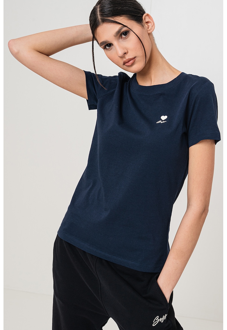 Caracteristici Culoare: bleumarin Imprimeu: uni Material: bumbac Croiala: regular fit Model: decolteu la baza gatului Lungime maneca: maneca scurta Detalii: imprimeu discret pe piept Compozitie Exterior: 100% bumbac Info model Modelul poarta un produs de marimea S. Marimi model: 181 cm inaltime