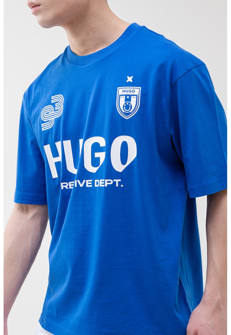 Caracteristici Culoare: albastru royal Imprimeu: text Material: bumbac Croiala: regular fit Model: decolteu la baza gatului Lungime maneca: maneca scurta Compozitie Exterior: 100% bumbac Info model Modelul poarta un produs de marimea M. Marimi model: 183 cm inaltime