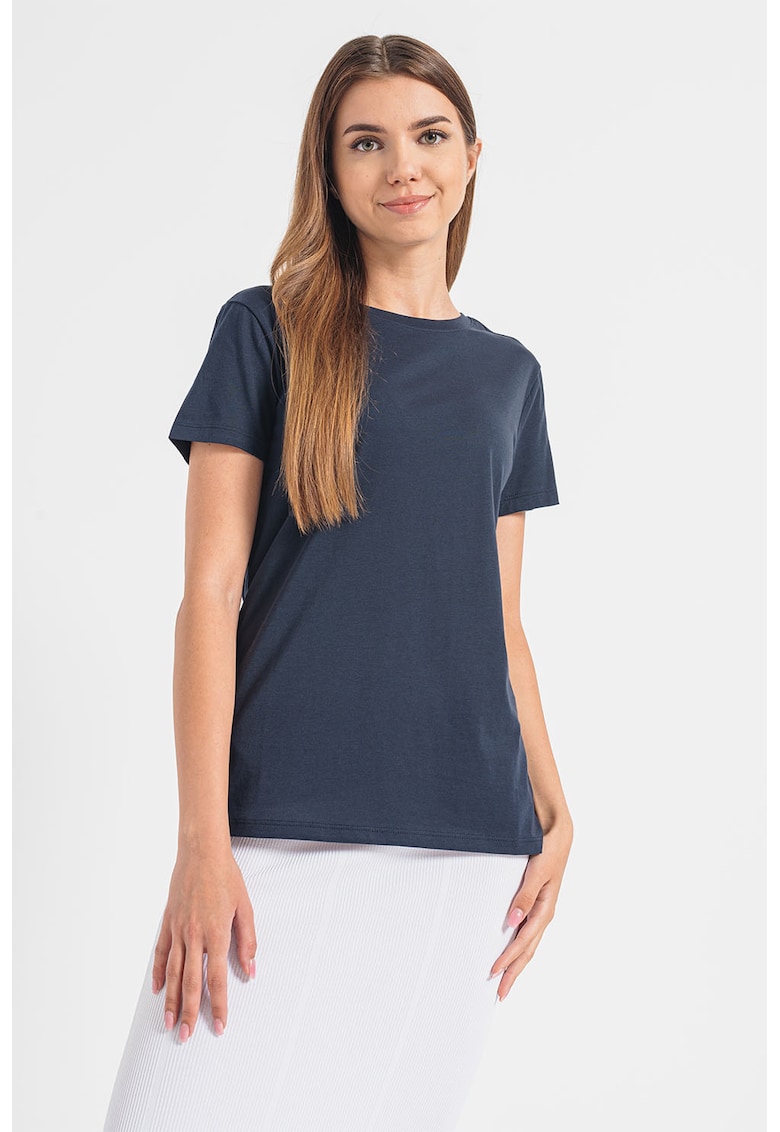 Caracteristici Culoare: bleumarin Imprimeu: uni Material: bumbac Croiala: regular fit Model: decolteu la baza gatului Maneci: cazute Lungime maneca: maneca scurta Compozitie Exterior: 100% bumbac Info model Modelul poarta un produs de marimea S. Marimi model: 173 cm inaltime