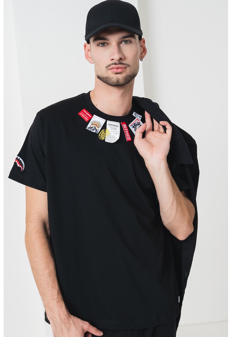 Caracteristici Culoare: negru Imprimeu: uni Material: bumbac Croiala: regular fit Model: decolteu la baza gatului Lungime maneca: maneca scurta Detalii: decorat cu etichete Compozitie Exterior: 100% bumbac Info model Modelul poarta un produs de marimea M. Marimi model: 190 cm inaltime